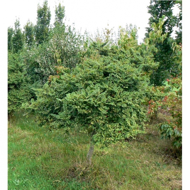 Petit arbre très décoratif, assez touffu et à la ramification fine. Il se développe lentement et est souvent greffé sur le tronc. Il forme une couronne ronde. Les rameaux sont bruns, tendres et pennés. Ils deviennent un peu tortueux en prenant de l'âge. La feuille est vert extrêmement foncé, oblongue, et mesure 2 à 3 cm de long. Le contour du limbe est doublement denté. Sa floraison est clairsemée. Hauteur : 3 m